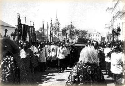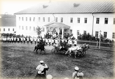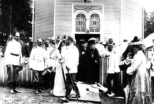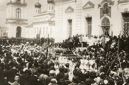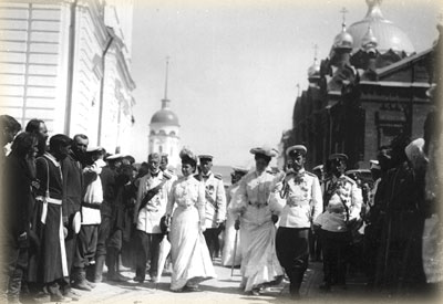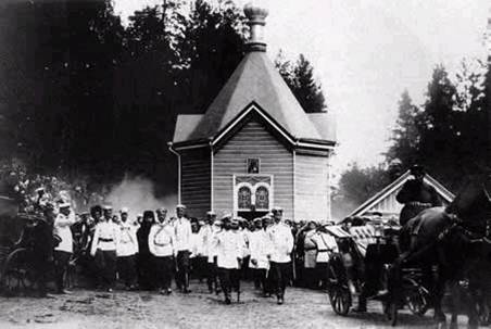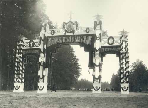 Как председатель правления железной дороги, по которой должен был ехать царь, мой отец был не только ответствен за поездку императора в Саров по железной дороге, но и за его семидесятикилометровый переезд от станции Сасово до монастыря по очень плохой дороге. На станции Сасово по этому случаю был сооружен павильон, сверху донизу покрытый свежими маргаритками, маками и васильками. На большом расстоянии от открытого места в прекрасном сосновом лесу, где находился монастырь, был слышен звон колоколов, призывающих к вечерней службе.